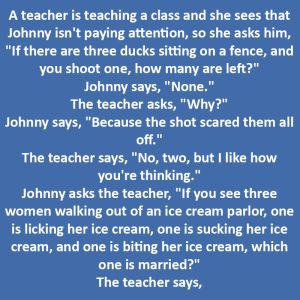 A teacher is teaching a class and she sees that Johnny isn’t paying attention, so she asks him, “If there are three ducks sitting on a fence,…